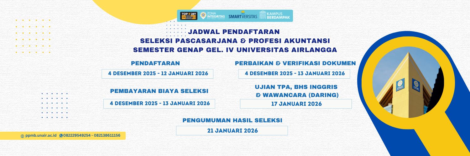 Pelaksanaan Ujian Wawancara Program Pascasarjana dan Profesi Gelombang III Semester Genap TA 2025/2026 Universitas Airlangga dilaksanakan pada hari Sabtu, 29 November 2025 mulai pukul 11.00 WIB secara online menggunakan aplikasi Zoom, serta untuk pembagian meeting ID dan passcode ujian wawancara dapat dilihat pada link berikut